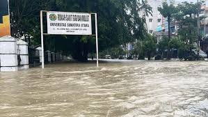 Banjir merendam Jalan Dr Mansyur depan Universitas Sumatera Utara (USU) di Medan. Banyak motor mogok, akses jalan terganggu, dan sebagian pengendara terpaksa menunggu air surut.
